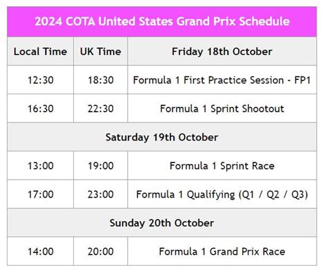 The F1 Austin Schedule aims to provide fans with a comprehensive guide to the event, including race times, practice sessions, and qualifying rounds. By organizing the schedule in an easy-to-read format, fans can plan their weekend at the circuit and ensure they don't miss any of the action. Additionally, the schedule provides information on ticket prices, parking, and other logistics to make the experience as smooth as possible.